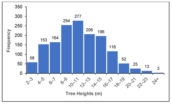 Histogram of tree heights (m) for the 1517 trees reassessed after Hurricane Ian (one tree omitted given missing height data).