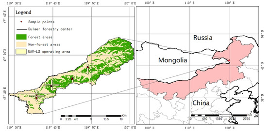 The study area (119°28′–120°01′ E, 47°15′–47°35′ N) is located in the middle section of the Daxingan Mountains in the northwestern part of Xing’an League, Inner Mongolia Autonomous Region, and is a comprehensive forestry site integrating natural and planted forests (Figure 1). It borders Mongolia to the west and Hulunbuir to the north and is an essential natural ecological reserve in China. The total area of the forestry field is 4,981,200,000 m2, of which 334,660,000 m2 is forestry land, accounting for 67% of the whole area. The forest coverage rate is as high as 61%, and the altitude is mostly 792–1495 m. The region has a cold-temperate continental monsoon climate with an annual average temperature of 1.48 °C; the coldest monthly average temperature is −25.6 °C and the hottest monthly average temperature is 16.6 °C. The mean annual precipitation is 437 mm. The forest is dominated by Betula platyphylla, Larix gmelinii, and some rare Populus davidiana and Pinus sylvestris.