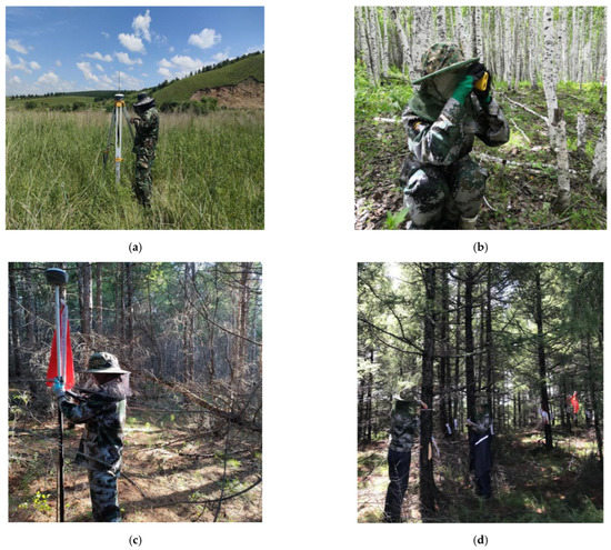 (a) Set up base stations. (b) Tree height measurement. (c) Obtain the coordinates. (d) DBH measurement and record.