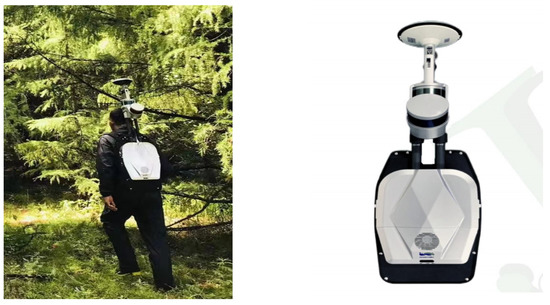 On 17 July 2022, the LiBackpack DGC50 (Figure 3), a ground-based backpack LiDAR system, was used for the sample site’s 3D point cloud data acquisition. Its camera image element is 3840 × 1920, its pixels are 1800 W, the laser’s laser wavelength is 9.03 × 10−7 m, and the scanning frequency is 300,000 pts/s. The steps for acquiring point cloud data are as follows: first, a GNSS receiver is used to obtain the absolute coordinates of a point with a stable GPS signal outside the sample area, and a reference station is established at that point to acquire static data. Next, an “S”-shaped route is designed, and the surveyor connects the phone to the LiBackpack to see the number of satellites searched and view the point cloud on the phone while collecting data in real-time. Data are collected while walking during the LiBackpack data acquisition process to avoid obstructions and to ensure high-quality point cloud data.