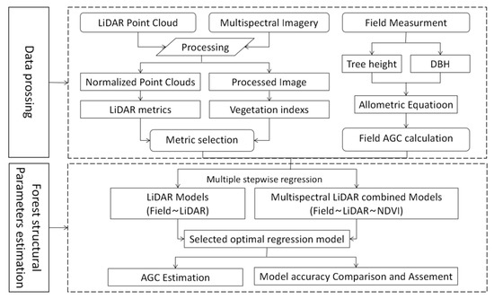 To further improve the accuracy of forest AGB and AGC estimation, a data fusion method of optical images and LiDAR data was proposed [7], which not only provides spectral information but also forest structure information and therefore can improve the accuracy of forest AGC estimation [20,21]. Popescu, S. et al. [22,23] showed that adding a large number of field measurements for modeling based on data fusion can also improve the estimation of forest AGB and AGC. Kim et al. [24] indicated that combining spectral information with attributes derived from LiDAR data is more suitable for assessing AGB and AGC estimates than using optical images or LiDAR data alone. The above study was based on a large amount of field measurement data, and the variables were entered into the regression model to estimate the accuracy. However, there are challenges in finding a method to build a regression model to accurately estimate forest AGCs with relatively few field measurements. We hypothesized that forest-related attributes (tree height, diameter at breast height) combined with remote sensing spectral indices through anisotropic relationships could be used to accurately estimate forest AGCs at the sample plot scale with fewer field measurements.