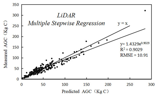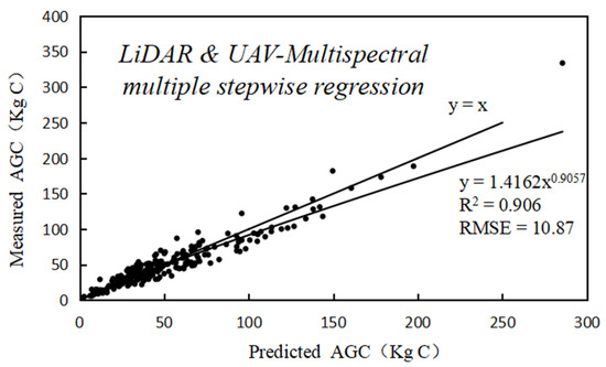 The AGC predicted by multispectral information combined with LiDAR data was obtained using Equation (7). As shown in Figure 8, the AGC predicted using the multispectral information combined with LiDAR data correlated significantly with the measured AGC. The predicted R2 for AGC was 0.906, and the RMSE was 10.87.