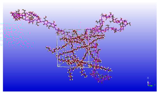 The hybrid model of paraffin–cellulose amorphous zone was set up by the Amorphous Cell module, which consists of eight paraffin molecules and one cellulose chain with a degree of polymerization of 20. The paraffin–cellulose amorphous zone hybrid model with a density of 1.5 g/cm3 [], the established model, is shown in Figure 2. Cellulose molecules are shown in stick mode, and the paraffin molecules are shown in ball-and-stick mode, with red balls representing carbon atoms and white balls representing hydrogen atoms.