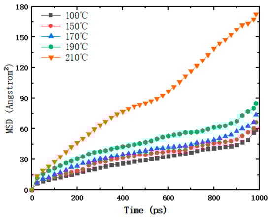 The paraffin–cellulose mixed model was analyzed, and the MSD curves of paraffin molecules at different temperatures were obtained, as shown in Figure 4.