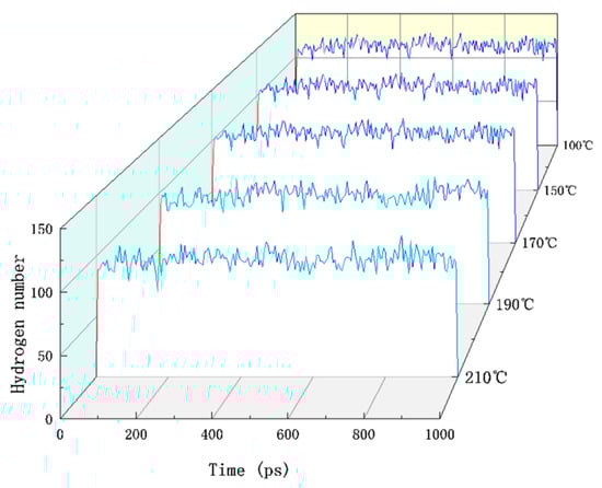 A hydrogen bond is a special intermolecular or intramolecular interaction whose strength lies in the interaction between chemical bonds and atoms []. Any hydrogen atom connected with a more electronegative atom in a compound molecule may be connected with another more electronegative atom in the same molecule or another molecule. There are hydrogen and oxygen atoms in cellulose molecules and hydrogen and oxygen atoms in adjacent positions, so they have the conditions for hydrogen bonding. Hydrogen bonding is an interaction that is slightly stronger than intermolecular forces and much weaker than covalent and ionic bonds. Hydrogen bonding in the paraffin–cellulose model plays a vital role in the cellulose molecules’ thermal and mechanical stability. Figure 5 shows the number distribution of hydrogen bonds between the paraffin and cellulose amorphous regions at different temperatures.