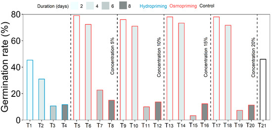 With the osmopriming approach in Santalum album L. seeds, the total germination period was reduced from 8 weeks (control) to approximately 6 weeks. Kumar and Rajalekshmi (2021) [40] also reported the superiority of osmopriming with PEG in terms of germination in winged bean. The results also show that hydropriming does not improve the germination percentage of Santalum album L. seeds above the control, and the germination percentage decreased with the increase in soaking duration, which was in conformity with [41], which studied Fir tree species. A decrease in the germination of hydroprimed seeds may be attributed to free radical accumulation, which stimulates lipid peroxidation during hydration, as reported in maize by [42].