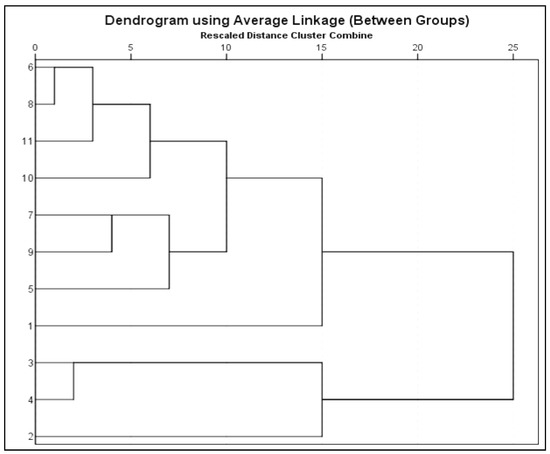Dendrogram based on hierarchical cluster analysis with Euclidian distance measure with the seedling growth attributes of Santalum album L.