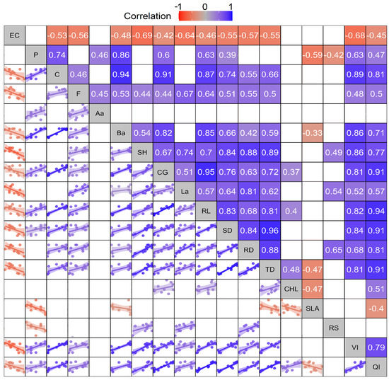 Correlation analysis between treatment level characteristics of seeds and seedlings with visualization of the linear relationship between the traits. EC—electrical conductance of seeds; P—protein content of seeds; C—carbohydrate content of the seeds; F—fat content of the seeds; A—α amylase content of the seeds; Ba—β amylase content of the seeds; SH—shoot height; CG—collar girth; La—leaf area; RL—root length; SD—shoot dry weight; RD—root dry weight; TD—total dry weight; CHL—chlorophyll content; SLA—specific leaf area; RS—root–shoot ratio; VI—vigor index; QI—quality index.