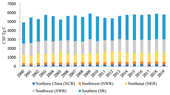 As shown in Figure 1, the CSF in China shows a fluctuating upward trend, increasing from 4921.03 Tg C in 2000 to 5821.74 Tg C in 2019, an increase of 18.30%. This is closely related to the successive launch of forestry programs in the new era, especially the Natural Forest Protection Project (NFPP) and the Sloping Land Conversion Program (SLCP), which has undertaken most of the country’s forest plantation tasks and achieved remarkable ecological construction results. In addition, the amount of CSF in all regions increased to different degrees. Specifically, it increased more than 40% in NWR and NCR, approximately 20% in SWR and SR, and 7.21% in NER. The amount of CSF varied among forest regions, with SR consistently ranking first by a wide margin, followed by SWR and SWR in third place, while NWR and NCR were at the bottom of the list.