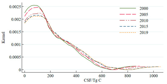 To further explore the temporal evolution of CSF in China, 2000, 2005, 2010, 2015, and 2019 were selected for kernel density estimation (see Figure 2).
