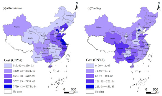 Using the optimal combination of marginal contribution (0.05, 0.30) (Tg C/104 ha) as the standard, the national average cost of CSF for afforestation was USD 412.53/t, while the average cost of CSF for tending was only USD 9.28/t, as measured by Equation (5). The CSF cost of afforestation was 44.44 times higher than that of tending, indicating that the return on carbon sequestration for afforestation was much lower than that for tending.
