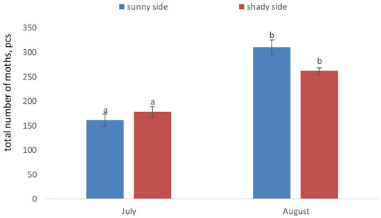 The first imagoes appeared in mid-June, the number of individuals of the first generation recorded in traps during a three-week collection period (from mid-June to early July) averaged 150 moths, both on the sunny and shady sides of the crown (Figure 1). However, already by the second generation, noted in the period from the last ten days of July to the end of August, the number of individuals in traps in the same period of fishing exceeded the number of imagoes of the first generation by 2.1 and 1.6 times on the sunny and shady sides of the crown, respectively. At the same time, the number of second-generation individuals caught on the sunny part of the crown was statistically significantly higher (1.25 times) than the number of individuals on the shady side.
