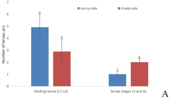 It is known that C. ohridella females of the first generation show very low selectivity when choosing A. hippocastanum leaves [37,38], therefore fluctuations in the number of miners on the sunny and shady sides of the crown did not exceed 10% and were statistically insignificant (p ≤ 0.05). However, already in the second generation, the choice of leaves by C. ohridella females could be influenced by intraspecific competition. The leaves of the sunny side of the horse chestnut crown were more affected by the orchid leafminer—the increase in the number in the second generation was 92.5%, while in the shady side of the crown, the growth did not exceed 47.2%. With a high daily solar radiation per unit area of leaf, leaves with a greater mass are formed on the sunny side of the horse chestnut crown. It is the availability of feeding that may be one of the factors that determine the high abundance of lifeminers on the leaves of the sunny side of the tree crown [39]. Additionally, as a result, a greater number of caterpillars of age L1–L4 (up to five individuals per leaf on the sunny side of the crown) develop on this part of the crown.