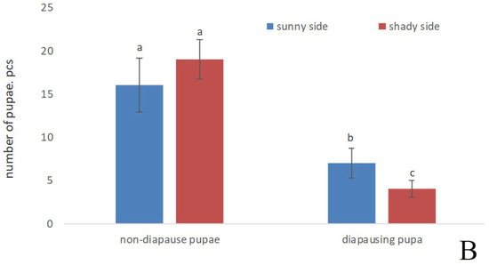 Larvae of the fifth stage are known to braid the lower part of the cocoon in the form of a lenticular convexity of the abaxial part of the leaf and behave in one of two ways: they form a shallow deformation of the leaf, and in this case, L6 larvae weave a very loose cocoon and turn into a pupa that does not enter into diapause; or L5 larvae produce a much deeper deformation of the lower surface of the leaf, and the sixth instar larvae that arise from them weave a very dense cocoon (and then the pupae enter diapause) [25]. An analysis of pupae, both falling into diapause and not going into it, showed that the average number of pupae per leaf that did not go into diapause was almost the same, both on the sunlit (16.5 individuals) and on the shady (17.5 individuals) sides of the tree crown. The number of such pupae was 2.2 and 4.4 times greater than the number of pupae falling into diapause on the sunny and shady sides of the crown, respectively. At the same time, the number of pupae falling into diapause on the sunlit side of the chestnut crown was 1.9 times more than on the shady side of the tree crown.