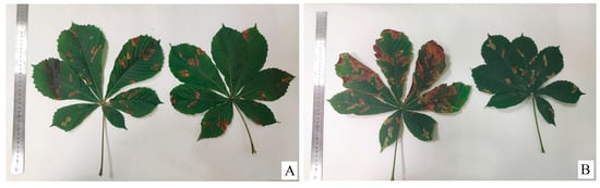 Horse chestnut leaves infested by Ohrid leafminer from the sun (A) and shadow (B) sides of the tree crown.