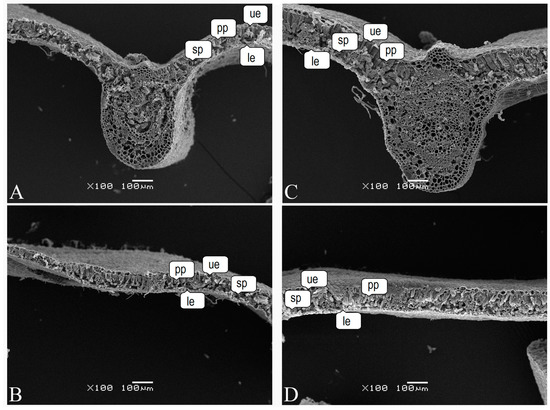 Cross sections of C. ohridella-infested Aesculus hippocastanum leaves under different illumination conditions (sunny side of the crown—(A,B); shady side of the crown—(C,D)) obtained using scanning electron microscopy (×400). Abbreviations: ue—upper epidermis, le—lower epidermis, pp—palisade parenchyma, sp—spongy parenchyma.