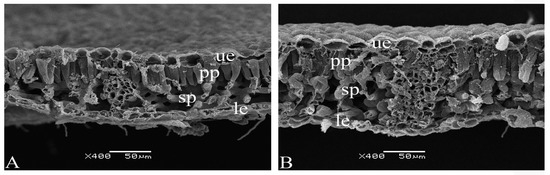 Fragments of a transverse cross sections of Cameraria ohridella-infested Aesculus hippocastanum leaves under different illumination conditions (sunny—(A), shaded—(B)), obtained using scanning electron microscopy (magnification ×400). Abbreviations (like Figure 4): ue—upper epidermis, le—lower epidermis, pp—palisade parenchyma, sp—spongy parenchyma.