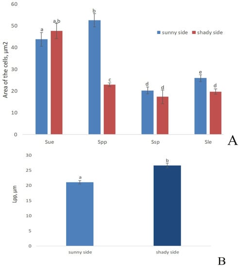 Morphometric characteristics of anatomical differences in leaf blade mesophyll specimens of horse chestnut leaf. Cross sections of Cameraria ohridella-infested Aesculus hippocastanum leaves under different illumination conditions (sunny and shaded), obtained using scanning electron microscopy (magnification ×400). (A)—The area of the cells of the upper and lower epidermis, as well as the palisade and spongy parenchyma of the leaf blade under different illumination conditions. Abbreviations: Sue—upper epidermis, Sle—lower epidermis, Spp—palisade parenchyma, Ssp—spongy parenchyma. (B)—Length of the cells of the palisade parenchyma of the leaf blade of horse chestnut under various illumination conditions (Lpp). Standard deviations are given as the margin of error. Means were compared in ANOVA using the Bonferroni test (histogram A) and the t-test mean comparison method. Means followed by the same letter are not significantly different at α = 0.05.