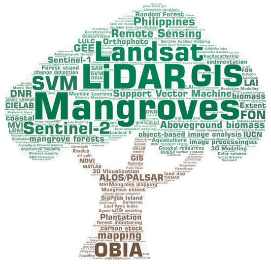 To achieve the main objective of this study, we conducted a thorough search in Google Scholar, Web of Science, and Mendeley in which we can easily find other studies related to the subject matter and be directed to other relevant article databases such as Researchgate, Elsevier, and Springer. There were 59 key studies identified in this work from the selection and documentation of published peer-reviewed articles. The method generally used in this study was the protocol search, appraisal, synthesis, analysis, report (PSALSAR) framework [34]. The preferred reporting items for systematic reviews and meta-analysis (PRISMA) [35] were also utilized. Most of the peer-reviewed articles were published in the same journals and conferences. The search was limited to articles published between 1979 and 2022 that used English keywords related to mangrove monitoring using RS in the Philippines. Figure 1 depicts a word cloud of keywords used in RS mangrove monitoring studies; the text size indicates the frequency of term usage.