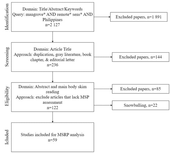 A search query was designed that would encompass all the articles with fundamental keywords in mangrove studies using RS in the Philippines. To obtain a comprehensive collection of related articles, the query with the keywords “mangrove* AND remote* sens* AND Philippines” (MSRP) was used to filter and exclude articles that did not share a common attribute with other articles for meta-analysis. In the initial stage, a total of 2127 records were found from Google Scholar (1980), Web of Science (106), and Mendeley (41), with 28% overlapped articles. After removing works of literature such as gray literature, extended abstracts, presentations, keynotes, book chapters, non-English language papers, and inaccessible publications, the number of studies was reduced to 236 retained for further title reading. After a thorough evaluation of the articles based on data types, platforms used, methods, and overall accuracy, only 122 articles fulfilled the criteria for further abstract and main body reading. Among them, 37 articles were taken for MSRP analysis since the scope of this study was limited only to the Philippines. This low number of published articles was expected, however, an additional step was taken to verify if there are still relevant articles to be included in the analysis.