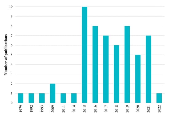 Figure 3 illustrates how mangrove ecosystem studies using RS have increased over recent decades, with an annual trend that is approximately exponential. However, years without any published papers related to mangroves and RS are not included in this figure. Based on our database, the first article on mangroves and RS was published back in 1979. Starting from 2015, there has been a sudden rise in mangrove and RS-related topics. Since then, the number of published articles related to mangroves and RS had a positive rise and fall trend compared to the previous years. The upward trend in published articles on mangroves and RS is due to the increased availability of RS sensors in recent years. An increase in mangrove forest loss and the initiative of academic institutions are also some of those important factors contributing to the increase in the number of publications [18,37,38,39,40].