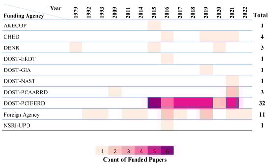 The number of programs and initiatives conducted by institutions together with the funding agencies are shown in Figure 4. It indicates that the DOST-PCIEERD has the most funded research papers from 2015 to 2021. This is due to the national-based program launched by the national government and in cooperation with other foreign agencies. Based on the products and results produced by LiDAR technologies in the Phil-LiDAR 1 project in flood hazard mapping [47,48], government agencies and the commercial sector in the Philippines have acknowledged the accuracy of LiDAR technology. Thus, the need for precise and accurate extraction of natural resources such as forests, which include mangroves, and high-value crops as baseline for mapping is vital.
