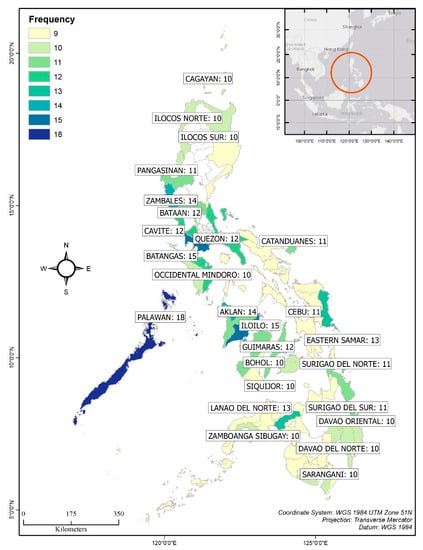 According to Giri et al. [58], the Philippines contains 1.9% of the world’s total mangrove area. However, the extent of mangrove disturbance is uncertain. Therefore, the need for updated studies on mangrove resources is vital. The province of Palawan has the greatest number of articles relating to any single province (18 studies); it has the largest mangrove forest cover in the country, with a total area of 54,457 ha [44]. Other provinces with numerous studies include Batangas and Iloilo (15 studies), Aklan and Zambales (14 studies), Eastern Samar and Lanao del Norte (13 studies), and 12 studies were conducted in five provinces including Bataan, Cavite, Oriental Mindoro, Quezon, and Guimaras. These studies found a significant and decreasing pattern of mangrove loss [56].