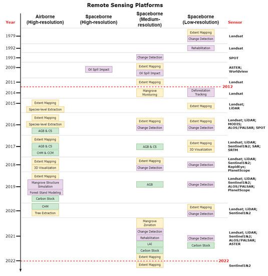 - Medium to low-resolution spaceborne satellite (e.g., Landsat 1 and 2, Sentinel-1 and 2, and SPOT-4) data are still commonly used in mangrove resource mapping. This is because, aside from the fact that spaceborne RS platforms have been available since the 1970s, it has also been made available to the public for free, with less pre-processing and less technical expertise required.