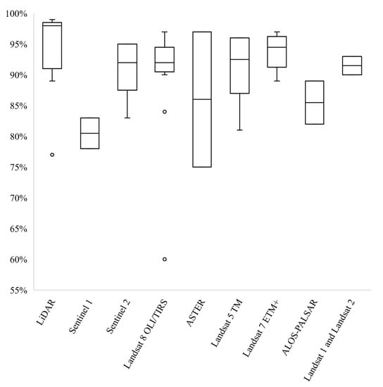Box-and-whisker plot illustrating the effect of sensors on overall accuracy. Box limits show the 25 and 75 percentiles; whiskers show the minimum and maximum values (except for outliers in LiDAR and Landsat 8 OLI/TIRS); lines inside the boxes represent the median. Sensors are recorded as they were used in the existing studies (combined or solo).
