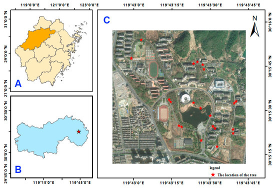 Study site. Picture (A) is the urban distribution map of Zhejiang Province, China, and the location of Hangzhou City, Zhejiang Province; picture (B) is Lin’an District; picture (C) is the sampling area, and the red dots represent the sampling points, indicating a total of 21 tree species sampling points.