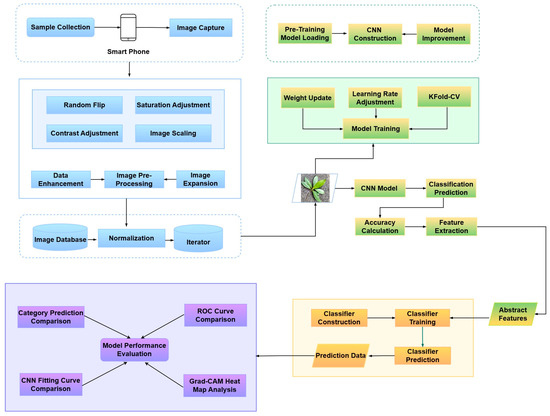 In recent years, convolutional neural networks (CNNs) in deep learning have been more widely adopted because they can integrate three-dimensional or even multidimensional leaf features more efficiently and CNNs are more efficient and semantically rich. CNNs methods can automatically extract features, simplify data preprocessing, and have local attention mechanisms to use leaf features extracted from receptive fields. Using convolutional kernels as a parameter sharing mechanism for sliding windows on images, features are extracted with the same preference mechanism in different regions, with good translation invariance, and using pooling layers–for example, to reduce feature dimensionality, extract key features, and speed up model fitting [16]. Indeed, Tan and Le 2019 [17] introduced a CNN method (EfficientNet) with faster training convergence and more efficient operation compared to previous models. Therefore, CNN can complete efficient recognition tasks.