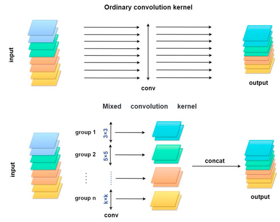 The upper part of Figure 4 represents the normal convolution operation, where all channel features use the same height and width convolution kernels and kin. Figure 4 indicates the scale of the convolution kernel. The lower part of Figure 4 is divided into mixed convolution kernel computation flow, where groups are combinations of multiple channels and each group uses a different size of convolution kernel, and Concat connects the feature maps output from different groups as the input features of the upper layer.