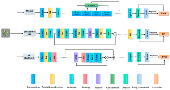 MixNet XL used KNN (nearest neighbors) classifier; EfficientNet B2 used RF (random forest) classifier; SE-Resnet50 used an SVM classifier. The composite model framework of CNN combined with each classifier is shown in Figure 5.