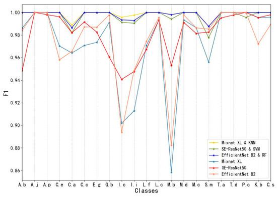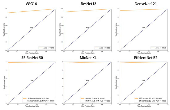 We further calculated the evaluation metrics, including over accuracy, precision, recall, F1-score, and AUC, to compare the predictive results for each model, and the specific values are shown in Table 4. The MixNet XL model with the KNN classifier had the highest recognition accuracy in all four metrics, followed by the EfficientNet B2 model with RF classifier, which was followed by the SE-ResNet50 model combined with the SVM classifier. Compared to VGG16, ResNet18, and DenseNet121, MixNet XL combined with KNN had increased accuracy, precision, recall, F1-score, and AUC area by 4.1%–9.57%, 3.73%–8.51%, 4.07%–9.64%, 4.02%–9.73%, and 0.021–0.05, respectively.