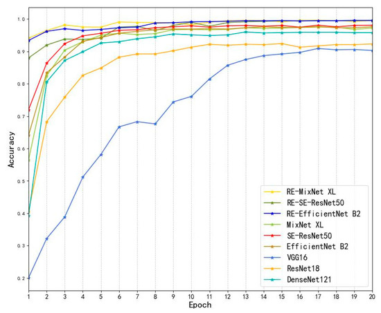 The initial losses of the experimental models were all lower than the original models. The initial losses of the RE-SE-ResNet50 model were greater than the other two experimental models, although the losses gradually decreased as the iterations increased, and they were 1.124–2.041 lower than the original models at epoch = 20. The losses were all lower than 0.032 for all experimental models, and the losses were 0.054–0.14 lower than the original models. The experimental models tended to fit without significant fluctuations at epoch = 13, and the classification results were better than the original models. Therefore, the experimental models can achieve better recognition capability with the same number of training times. It can be seen that the improved experimental model can obtain better feature extraction performance and provide high-level abstract features for classifier training and prediction.