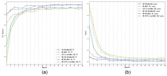 Figure 12 shows the change curves in the F1-scores and loss values of the original model and experimental models as the number of training iterations increased. The F1-score and loss values of the experimental models were the average values of the corresponding metrics of the K-Fold–CV models. The initial F1-score of the experimental models was higher than the original models. The initial F1-score of the RE-SE-ResNet50 model was slightly lower than the other experimental models, yet as the iteration numbers increased, they increased to over 0.97 at epoch = 20, which is an improvement of 2.2%–3.6% compared to the original models.