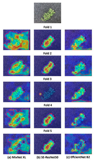 To illustrate the important regions of concern in the prediction of different models, we applied the Gradient-weighted Class Activation Mapping (Grad-CAM) method to generate the heatmap. Figure 13 indicated that the attention regions of MixNet XL and EfficientNet B2 models in the final convolutional layer were mixed with different background features, especially in the MixNet XL K-FOLD1 model, the activation regions near the twigs background were especially obvious (Figure 12). MixNet XL model had a larger activation area, which focused on the front and middle positions of multiple leaves; thus, had a larger range of recognition attention regions. Except for the K-FOLD3 model, other models in the SE-ResNet50 model could better concentrate on the twigs and dense-leaf region and had no dispersion in the attention region. The key activation area gradually decreased from the branches and leaves to the front of the leaves.