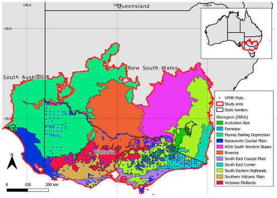 The study area covered 25.4 Mha of forested land in southeast Australia. Its boundaries were defined as the extent of all 11 biogeographic regions (Interim Biogeographic Regionalisation for Australia, or IBRA) that can be found in the state of Victoria, some of which stretch across the border into the neighbouring states New South Wales and South Australia, as shown in Figure 1. Each IBRA region features distinct climatic, geological and ecological properties [27].