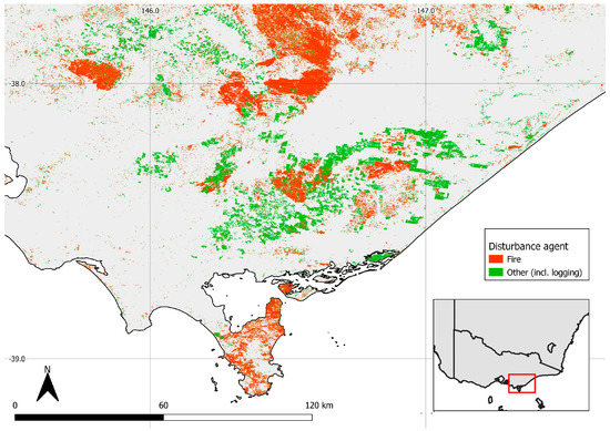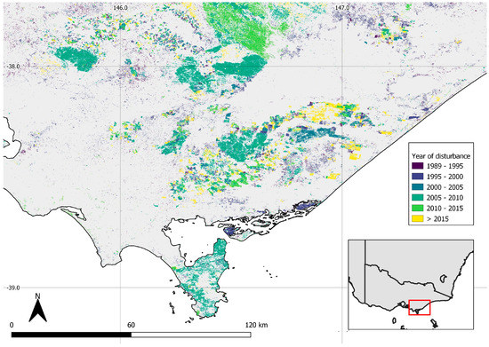 - Haywood, A.; Verbesselt, J.; Baker, P. Mapping Disturbance Dynamics in Wet Sclerophyll Forests Using Time Series Landsat. Int. Arch. Photogramm. Remote Sens. Spatial Inf. Sci. 2016, XLI-B8, 633–641. [Google Scholar] [CrossRef]