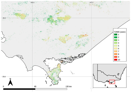 Spectral recovery after fire as measured by the Years to Recovery 80 percent (Y2R80) metric, for a selected part of the study area.