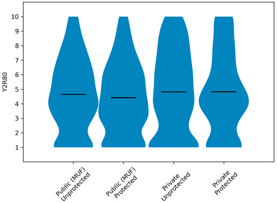 Subsequently, we created violin plots of the Y2R80 distribution across forest tenure and protection status categories and conducted ANOVA tests using randomly subsampled groups (n = 1000 in each). Figure 5 demonstrates that the mean values of all categories are similar. ANOVA tests and subsequent pairwise comparisons yielded no significant differences between most groups (p > 0.05), except for those between the protected public and protected private group (p < 0.005) which on average took 4.5 and 4.9 years to recover to pre-disturbance spectral levels, respectively.