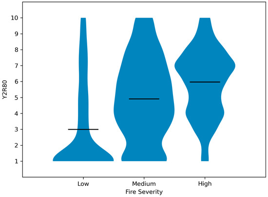 Violin plots of the distribution of the Years to Recovery (Y2R80) values across the three fire severity categories. Black lines indicate the mean value.
