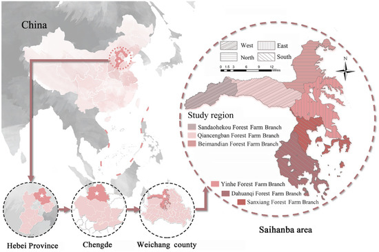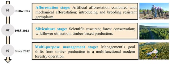 SHB Forest Farm is located in Weichang county, Chengde city, Hebei province, China (42°4′–42°36′ N, 116°53′–117°39′ E), on the southern edge of the Hunshandake Sandy Region in Inner Mongolia [35] (Figure 1). The study area includes six subfarms and 30 operational areas, covering approximately 933.33 km2. The elevation ranges from 1010 to 1940 m. The region has a typical semiarid and semihumid cold temperate continental monsoon climate with an average annual temperature of −2.7 °C and an average annual precipitation of 460.3 mm [36]. Over the past 50 years, the local government and forest managers of SHB have actively explored and implemented the restoration strategies of the “Integrated Management of Mountains, Water, Forests, Farmland, and Lakes”. It has continuously promoted the construction of key ecological projects, and the quality of the ecological environment has shown a trend toward stability and improvement. The deteriorating trend of various natural ecosystems has been basically curbed, and the ecological security barrier framework has been constructed [31]. Reviewing SHB’s development history (Figure 2), although significant ecological construction achievements have been made, continuing large–scale and high–density afforestation work due to the characteristics of artificial forest ecosystems and against the background of global climate change may lead to soil degradation and a decline in the water retention capacity of the ecosystem, posing many risks that could affect its future sustainable development.