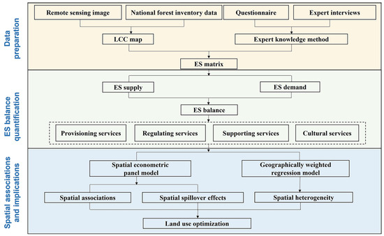 As shown in Figure 3, the workflow of this study consisted of three parts: (1) data collection and preprocessing, (2) ES balance quantification, and (3) spatial correlation analysis of the ES balance. The practical significance of each part has also been explained (for details, see Section 2.3.1, Section 2.3.2 and Section 2.3.3).