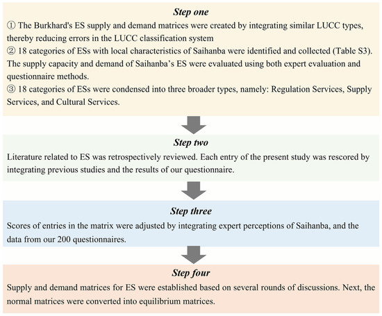 Based on the ES matrix method proposed by Burkhard et al. [17,45], the ES balance of the study area in 2002, 2012, and 2020 was quantified. Next, a four–step adjustment framework (Figure 4) was applied to adjust the original matrix using expert knowledge to generate the adjusted supply–demand matrix of ES (Figure 5). The equations for the ES supply index (ESSI), demand index (ESDI), and balance index (ESBI) were as follows: