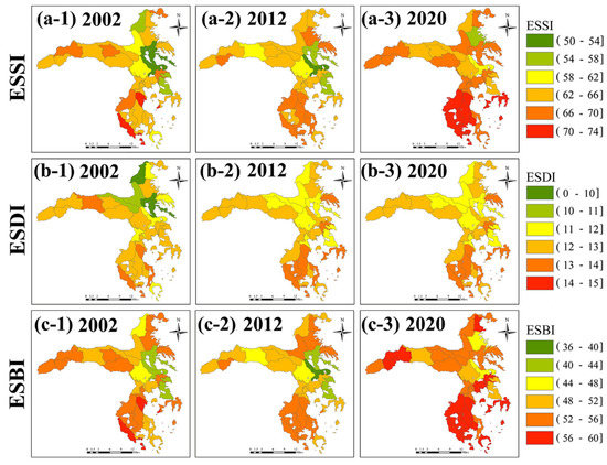 The area of high ES index in the study region exhibited a gradually increasing tendency from 2002 to 2020 (Figure 6). In detail, the ESSI was higher (62–74) in the southwest and lower (<58) in the east. Meanwhile, the ES supply capacities both increased rapidly in the two areas from 2012 to 2020, and the ESBI showed a similar pattern. The ESDI was higher in the southeast (11–15) but consistently lower in the northern region due to its low proportion of built–up land. The study region has demonstrated an ES surplus, as indicated by the consistently non–negative values of the ESSI, ESDI, and ESBI indices, regardless of whether they were evaluated in terms of space or time. Additionally, from 2002 to 2020, the degree of ES surplus in the region has shown a continuous increase. (Figure 6).