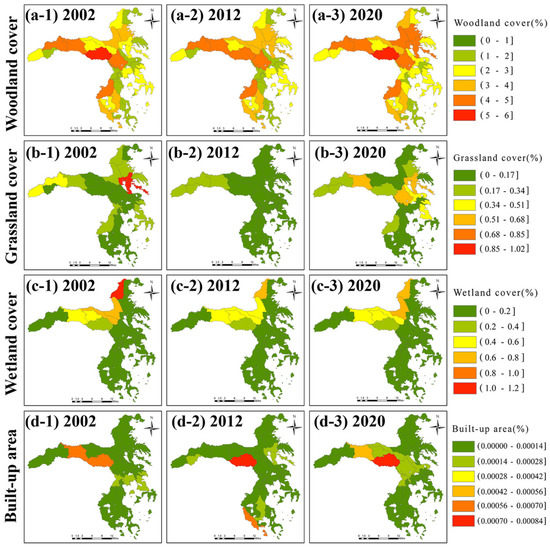 From 2002 to 2020, the proportion of forestland witnessed a gradually increasing trend. In contrast, the proportion of unused land as well as wetland continued to decrease during this period (Supplementary Figure S4). The results of the spatial patterns of major forest types in SHB demonstrated that the proportions of woodlands, grasslands, and built–up land were also gradually increasing, while the proportions of wetlands showed a downward trend (Figure 7). Moreover, in forests, dense forests showed a continuous upward trend, while sparse forests and young forests showed a gradual downward trend, and shrub forests showed no significant changes from 2002 to 2020 (Figure S1).