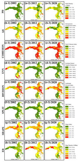 Spatial patterns of landscape metrics of Saihanba in 2002, 2012, and 2020. PD, patch density; DIVISION, landscape division index; SPLIT, splitting index; ED, edge density; ENN, Euclidean nearest neighbor distance; COHESION, patch cohesion index; IJI, interspersion juxtaposition index; SHAPE, shape index.
