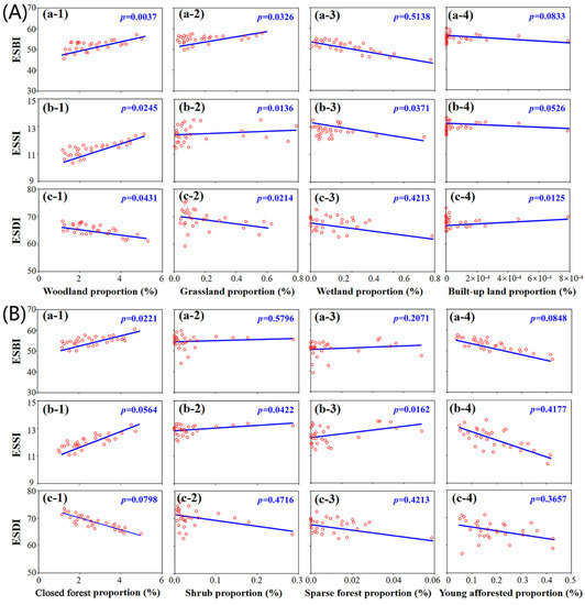 The ESBI and ESSI indexes were positively correlated and the ESDI was negatively correlated (p < 0.05) with the proportions of woodlands and grasslands. Wetland proportions were negatively correlated with all three indexes, while the built–up proportion was positively correlated with ESDI and negatively correlated with ESBI and ESSI (Figure 9).