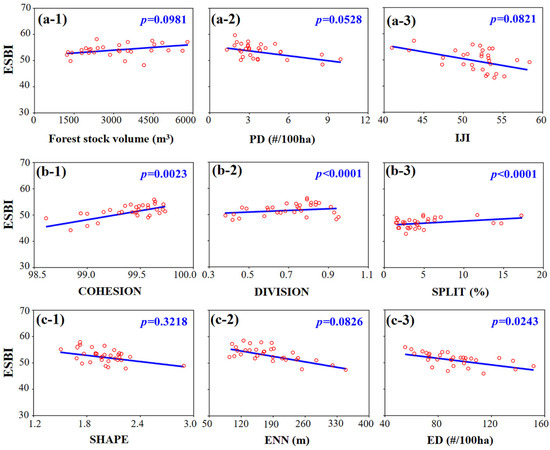 ESSI and ESBI were positively correlated with landscape indicators such as COHESION, DIVISION, SPLIT, and forest stock volume (Figure 10 and Supplementary Figure S2). However, they were negatively correlated with IJI and ENN. As for ESDI, it was positively correlated with most of the landscape indicators, except for IJI, SHAPE, and ENN (Supplementary Figure S3).